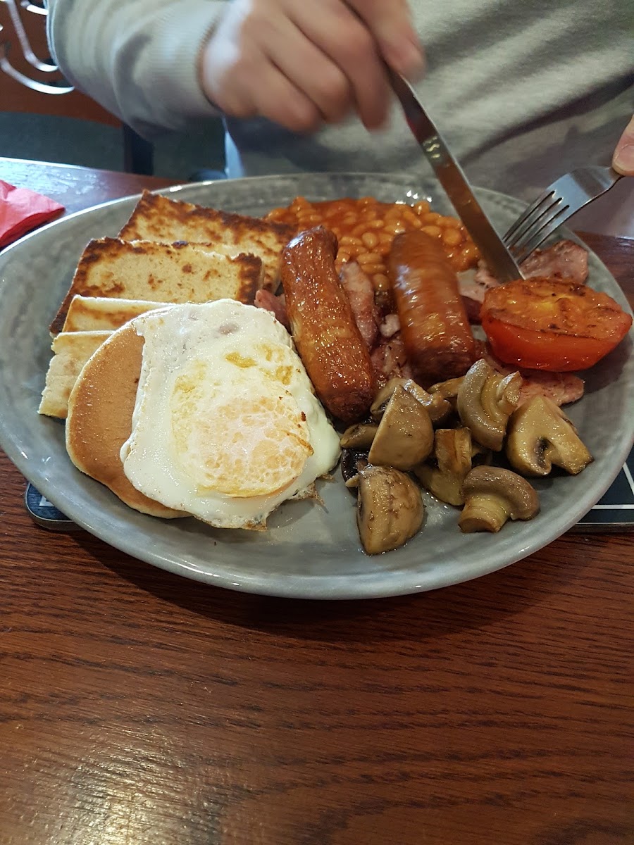 This was our 1st visit. A busy Sunday with really friendly staff who obviously had their own role within the business. However, they were all working in sync with each other & nothing was forgotten. Top marks to all the staff . Food portions were generous & reasonably priced. This was my brother's sausage , bacon egg & chips ...Will definitely be back...