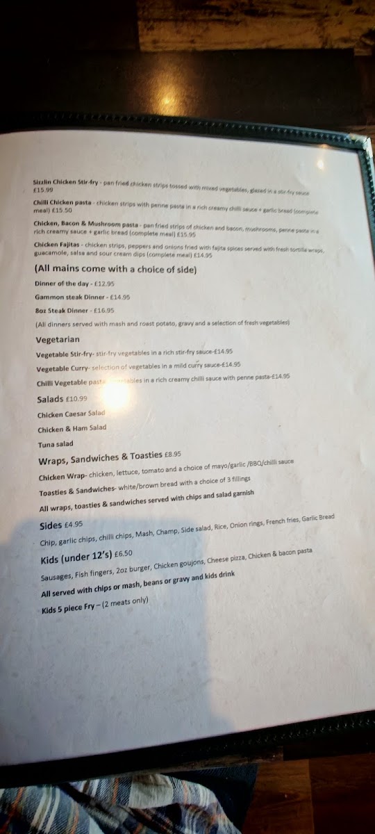 - Lunch & Dinner: Well-loved mains include Gammon Steak, Chicken Fajitas, and Chilli Beef Pita, suitable for sharing or a satisfying solo meal.
